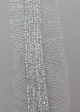 Crystal and seed bead trim in ivory.