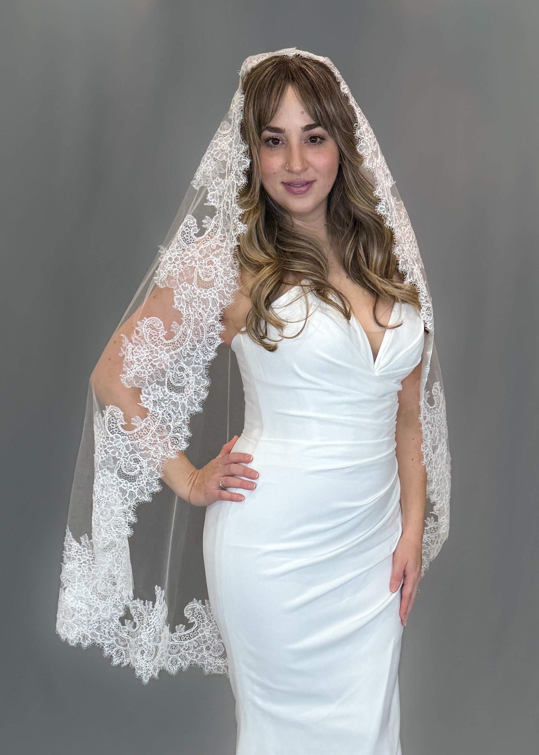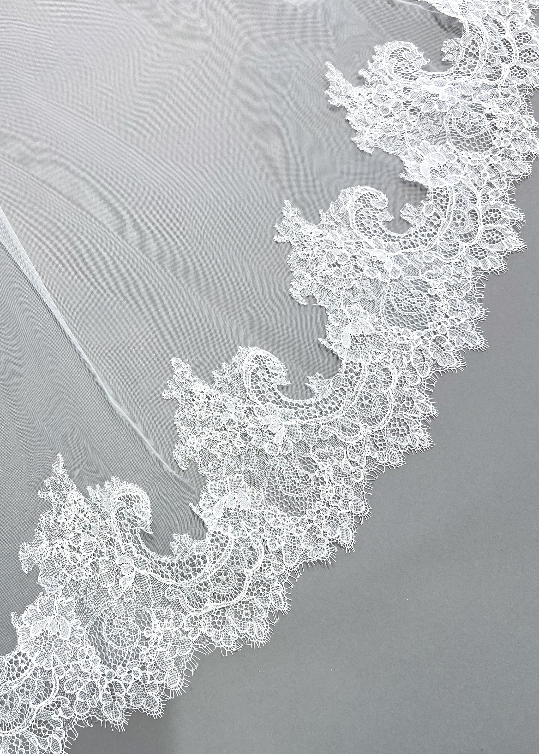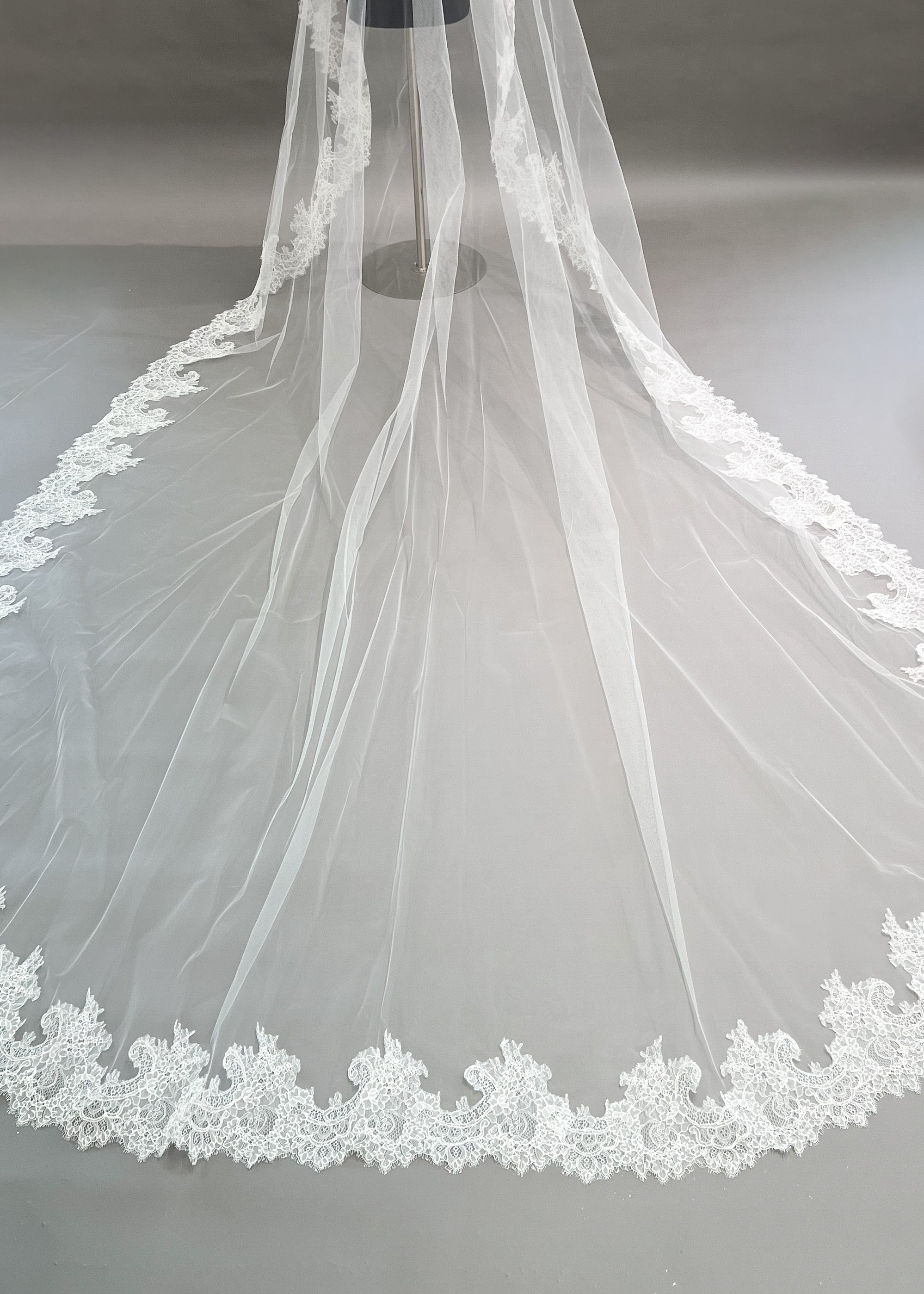 Hudson is a stunning Mantilla cathedral veil, adorned with delicate Chantilly lace. The long length and intricate lace detailing add a touch of elegance, making it the perfect choice for any bride.