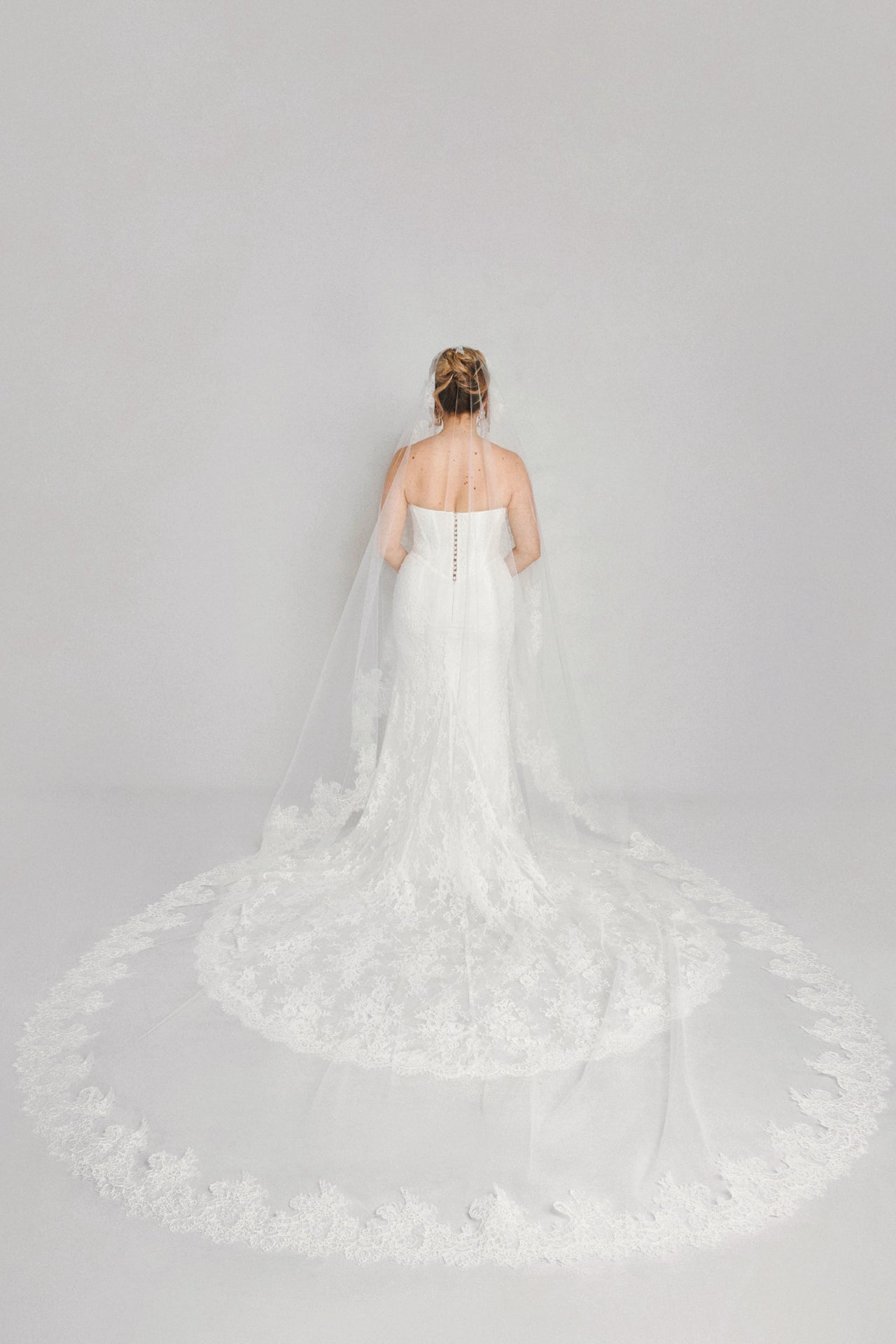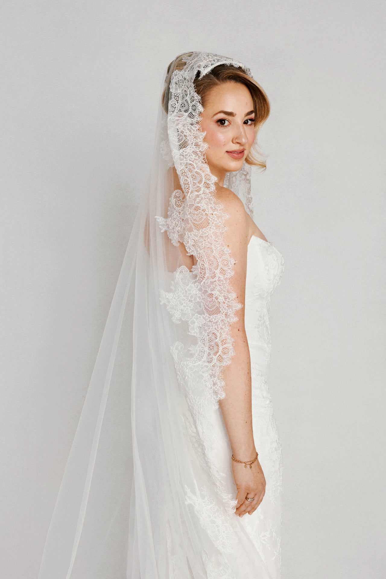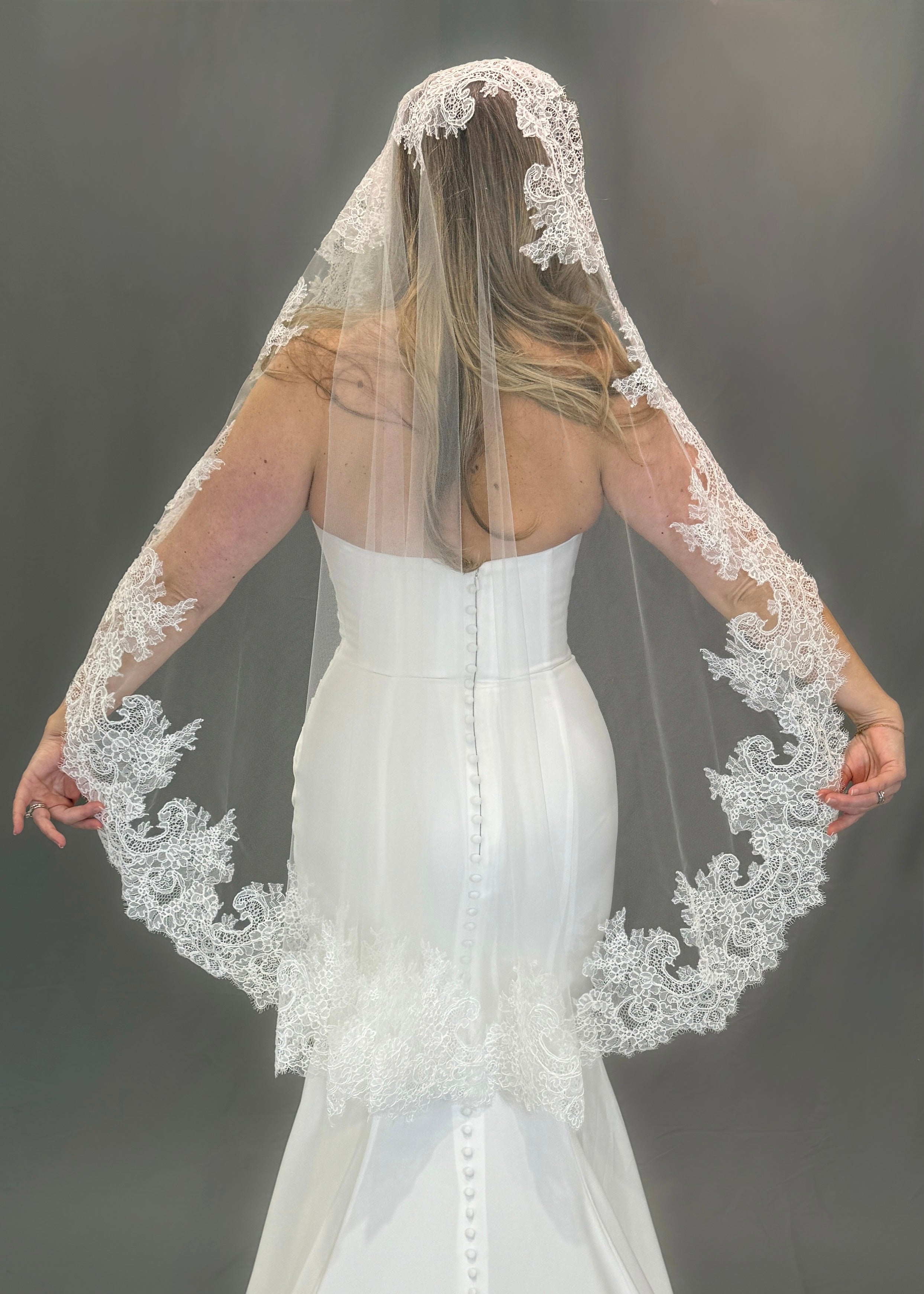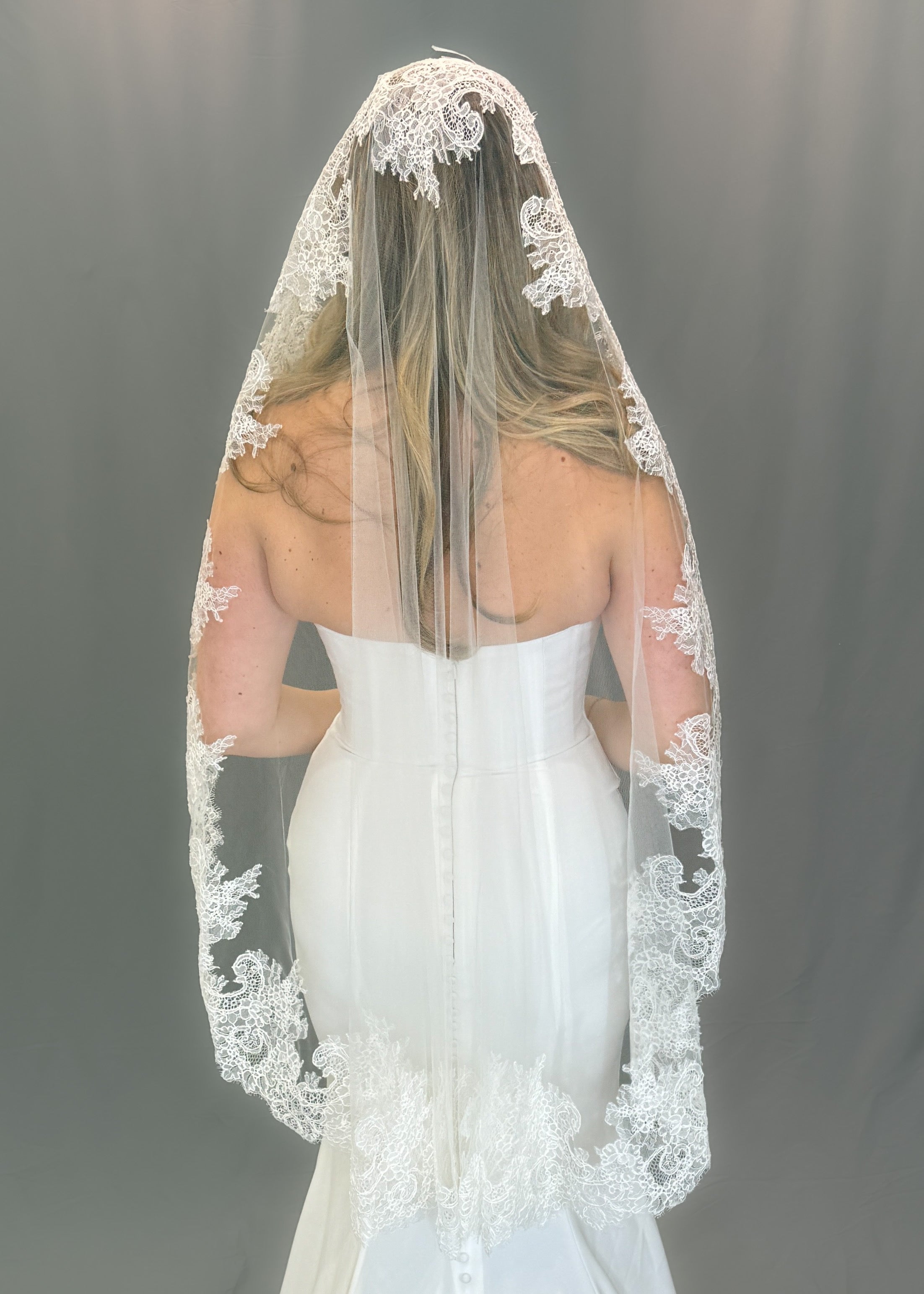 Hudson is a stunning Mantilla cathedral veil, adorned with delicate Chantilly lace. The long length and intricate lace detailing add a touch of elegance, making it the perfect choice for any bride.