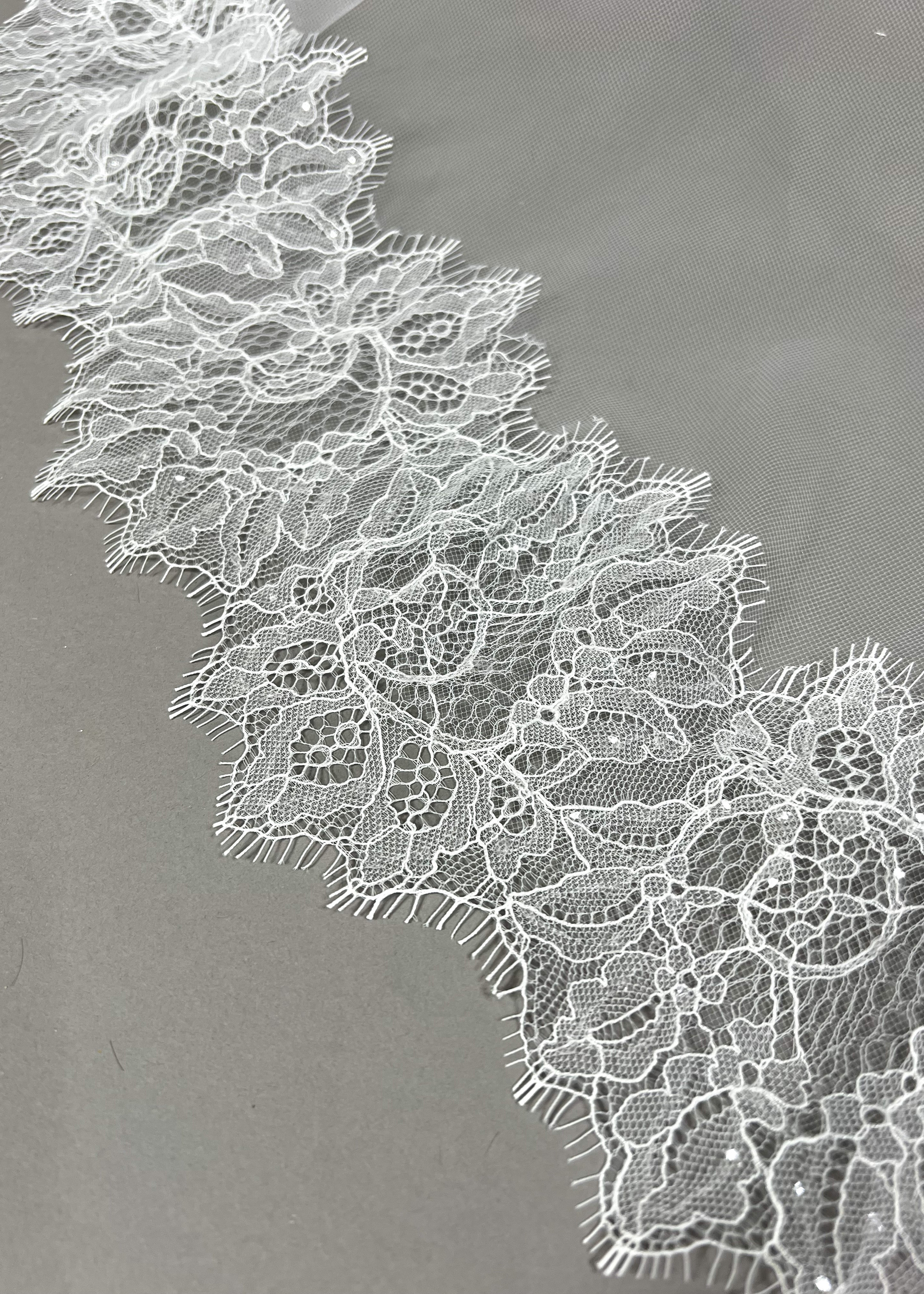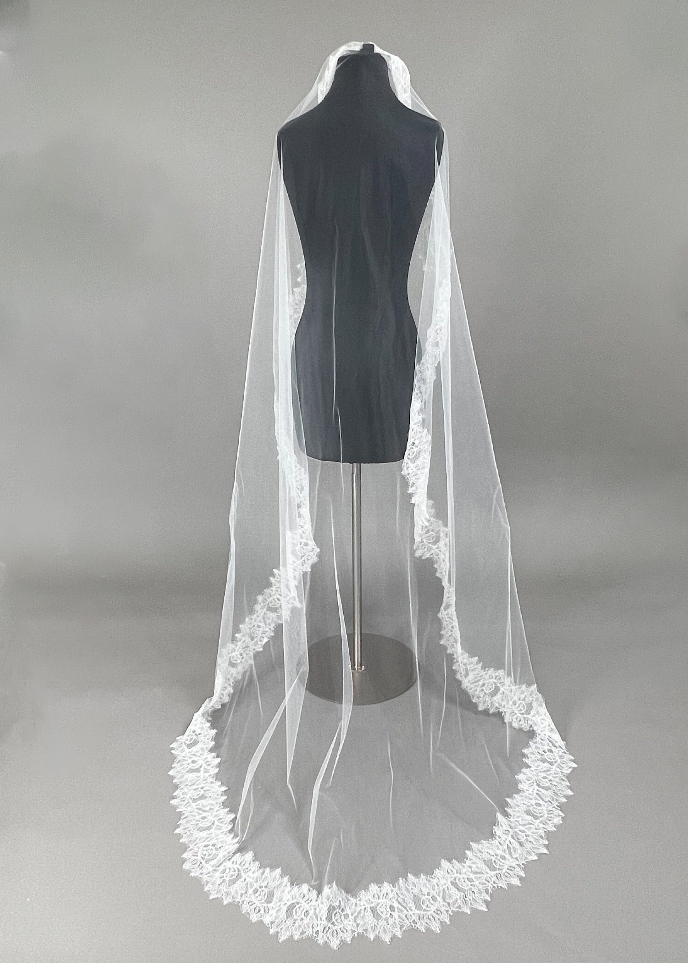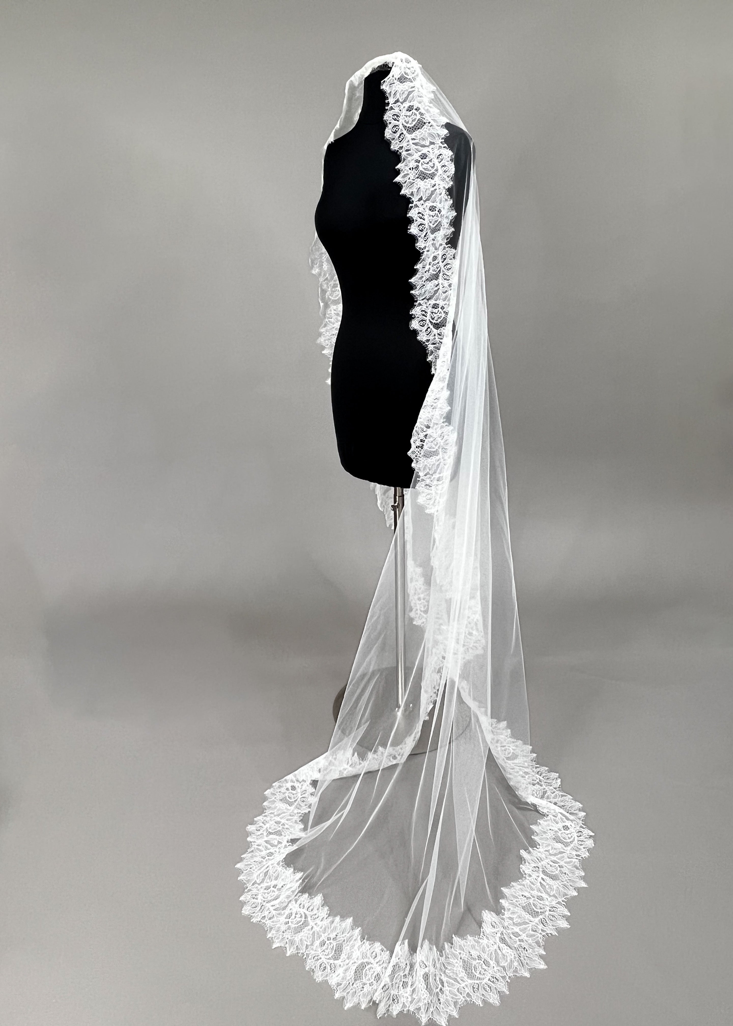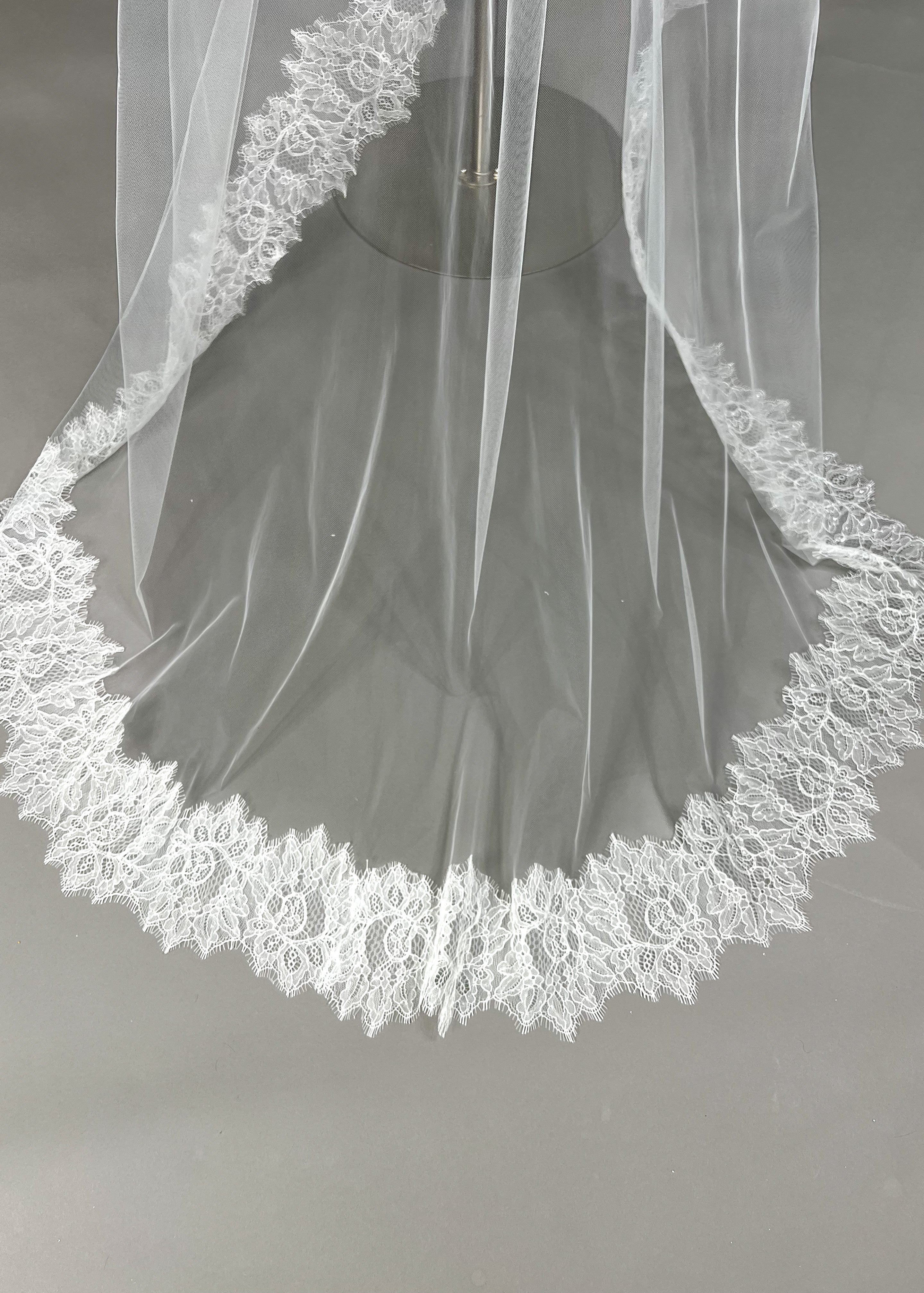 Transform into a vision of elegance with Mae, featuring a luxurious Mantilla veil adorned with delicate Chantilly lace and a little shimmer with clear sequin throughout lace.