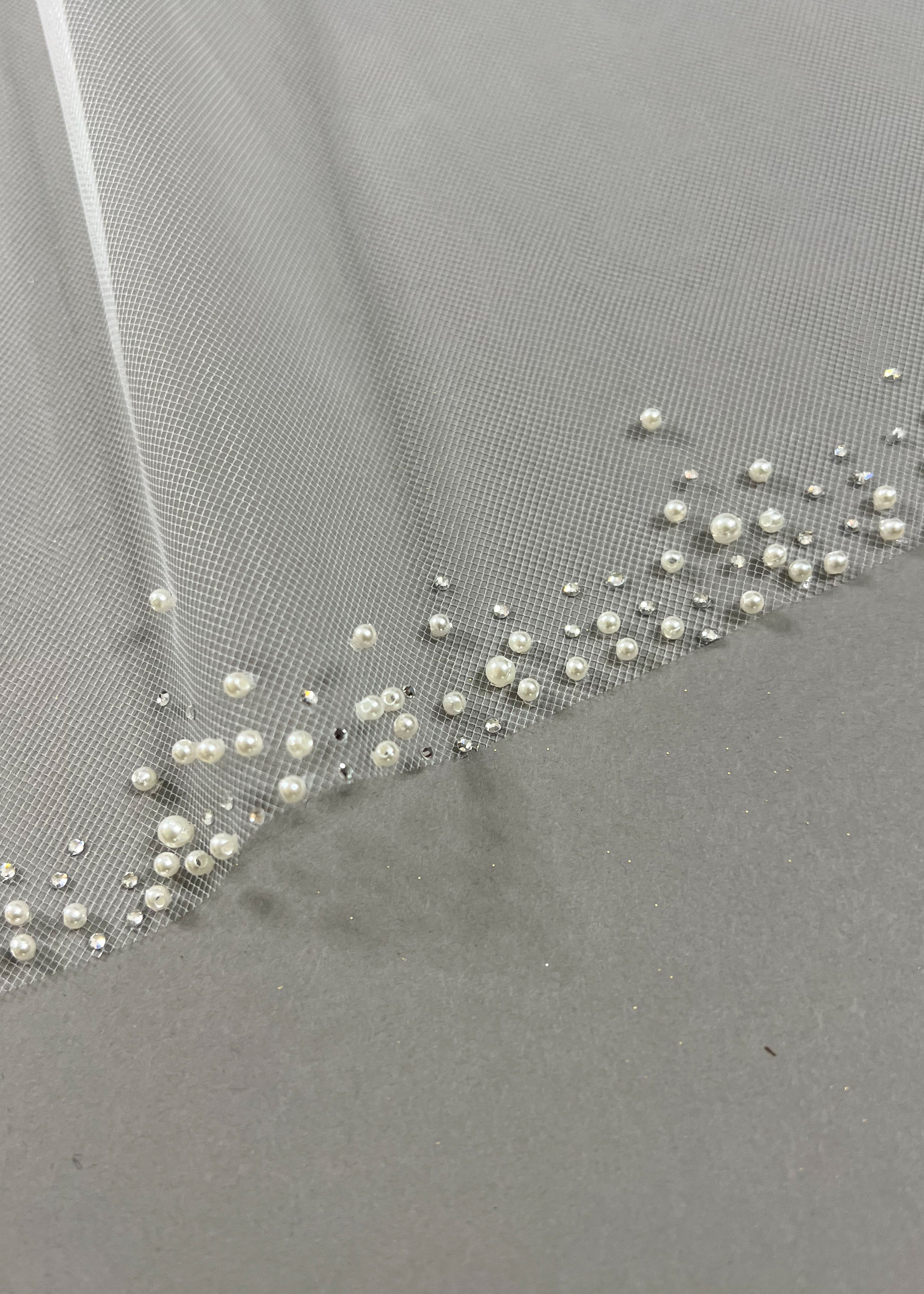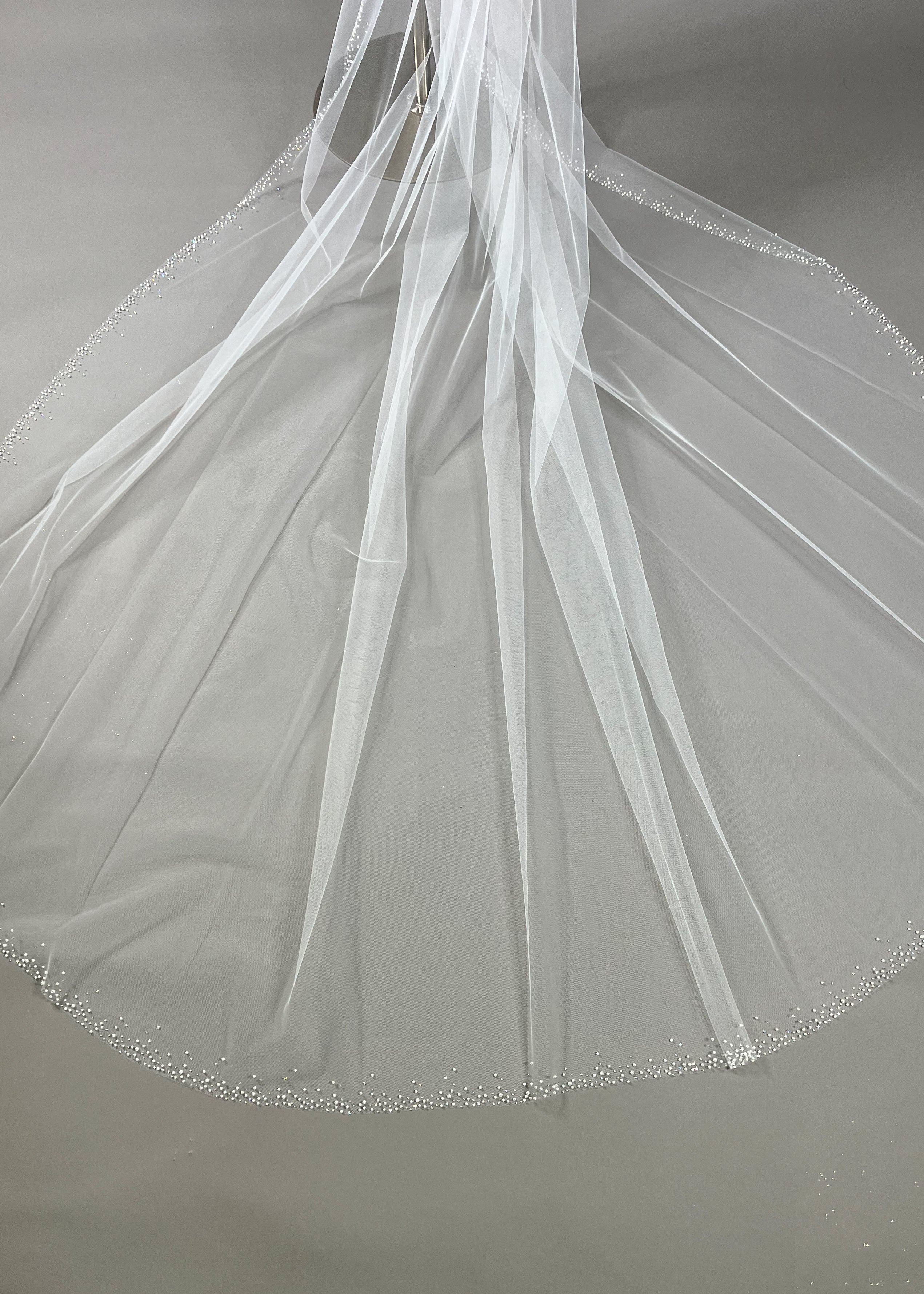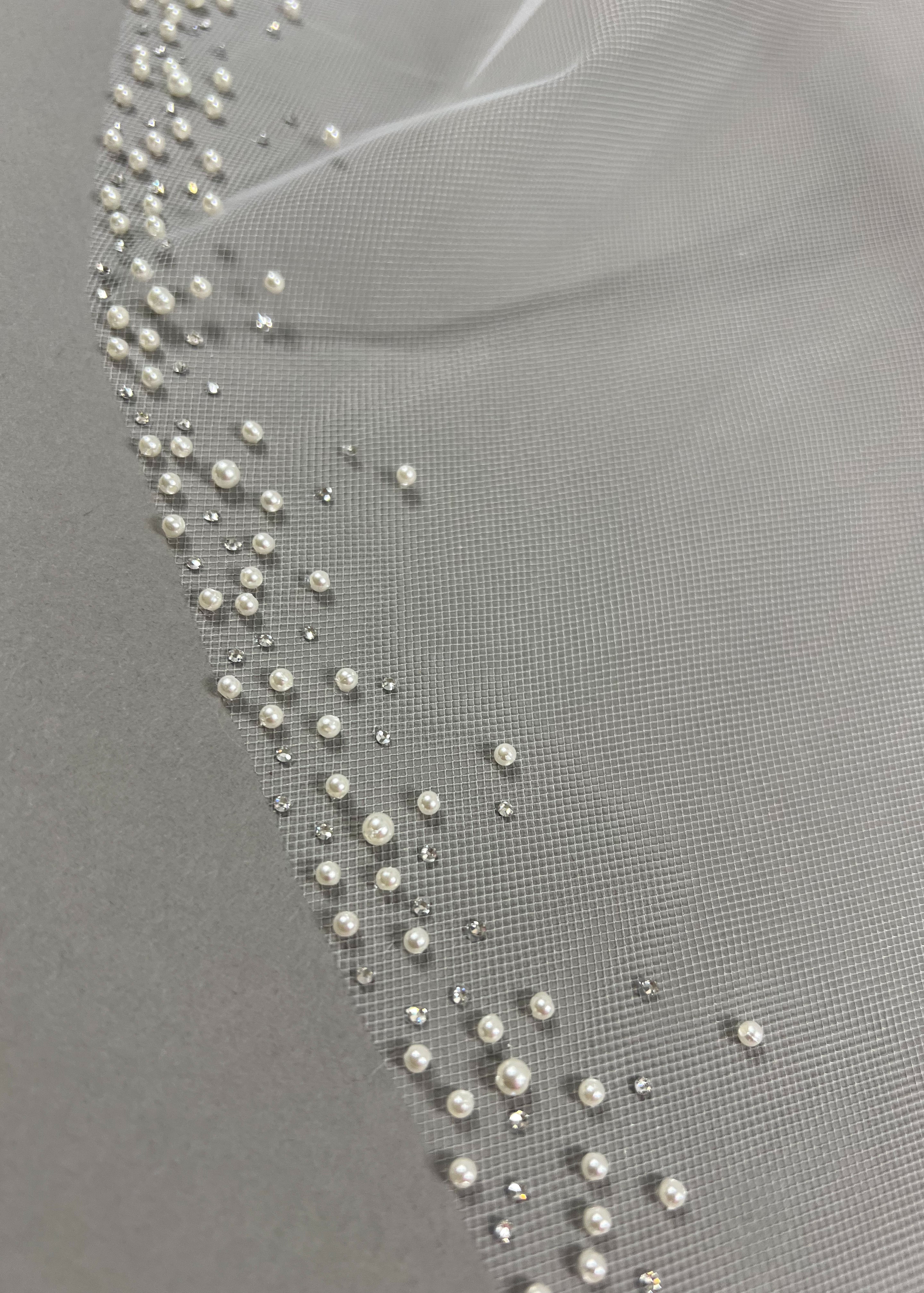 Indulge in timeless elegance with our fingertip ivory tulle veil. Delicately scattered with crystals and pearls, this piece exudes sophistication and opulence.