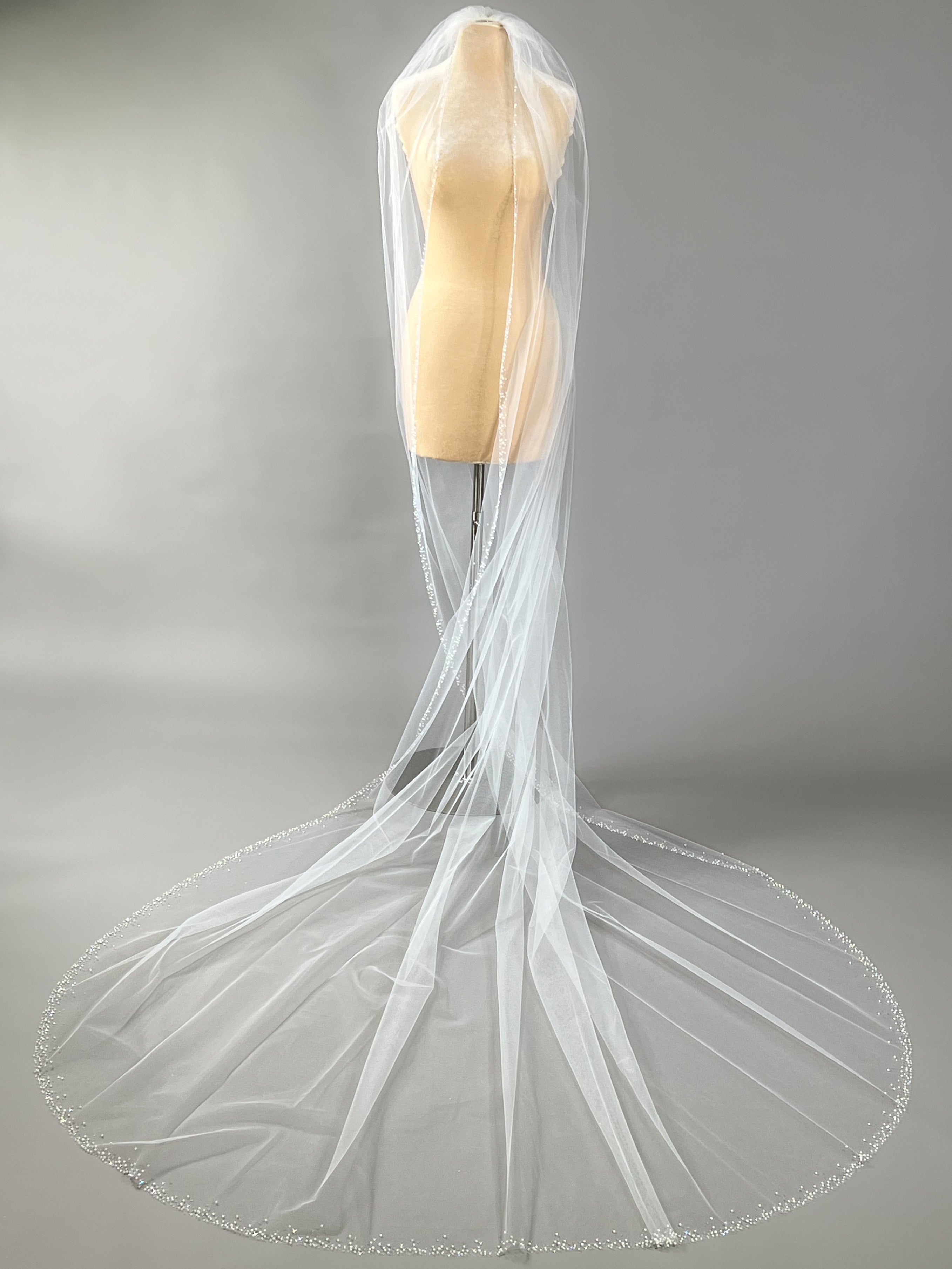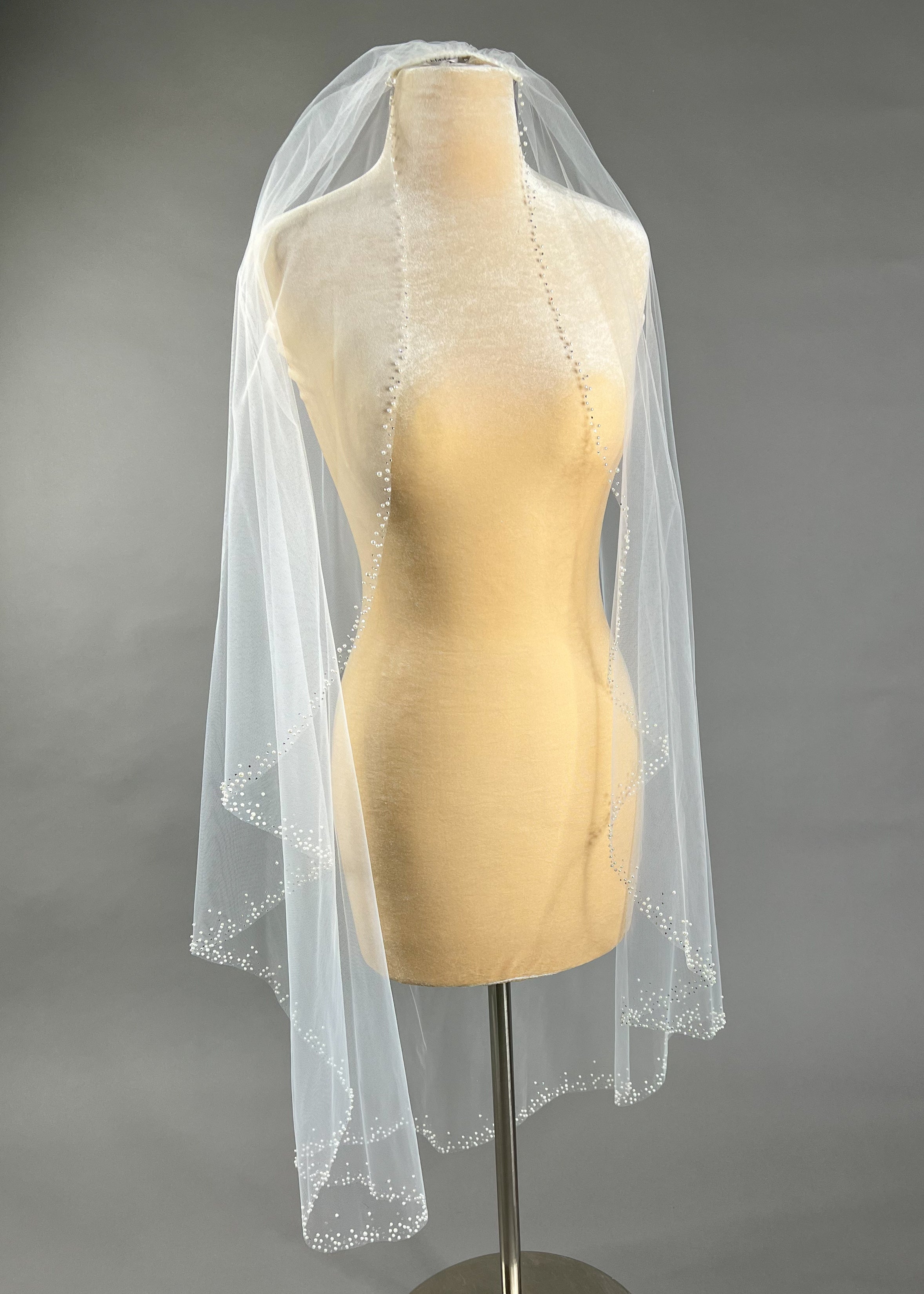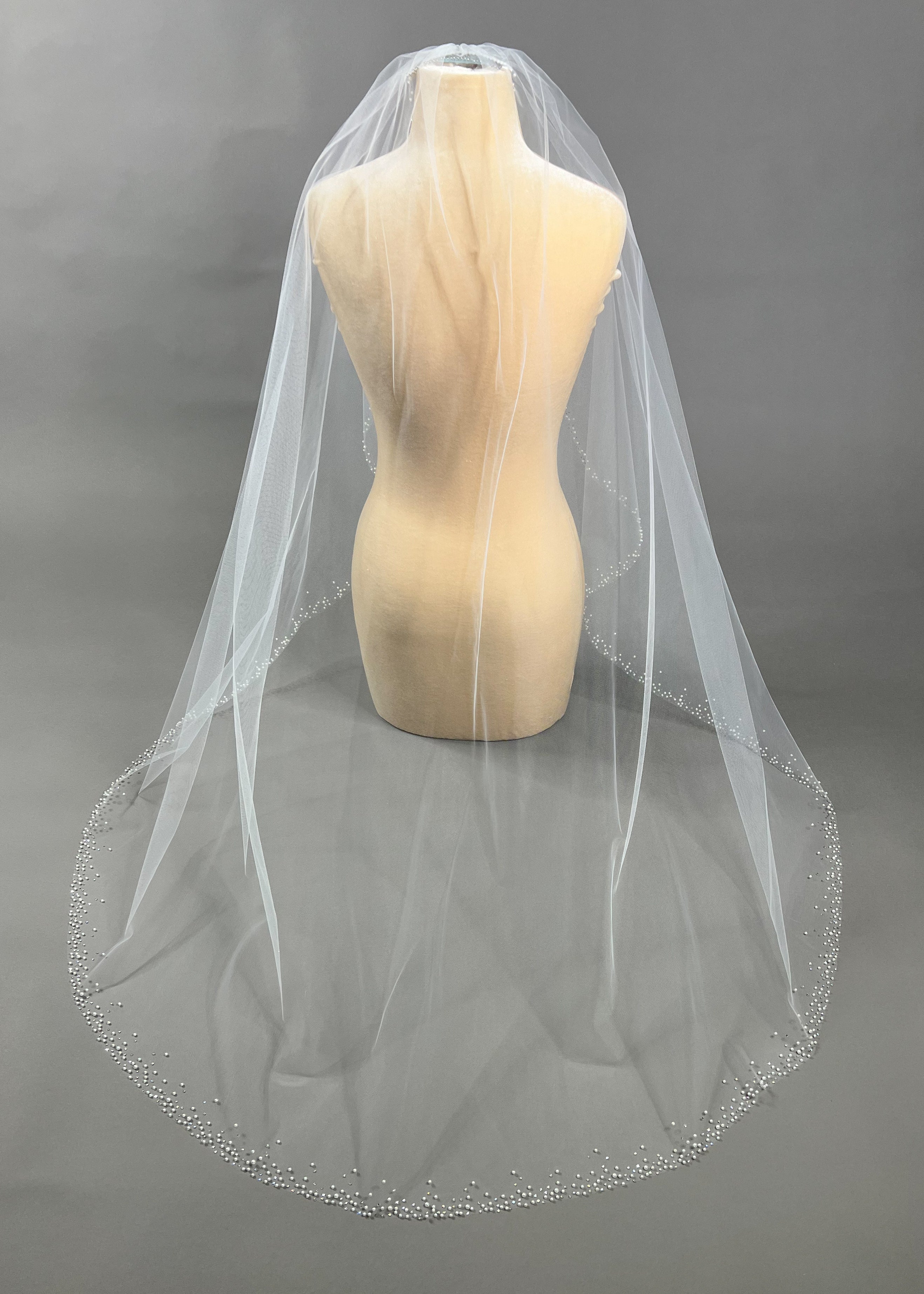 Indulge in timeless elegance with our fingertip ivory tulle veil. Delicately scattered with crystals and pearls, this piece exudes sophistication and opulence.