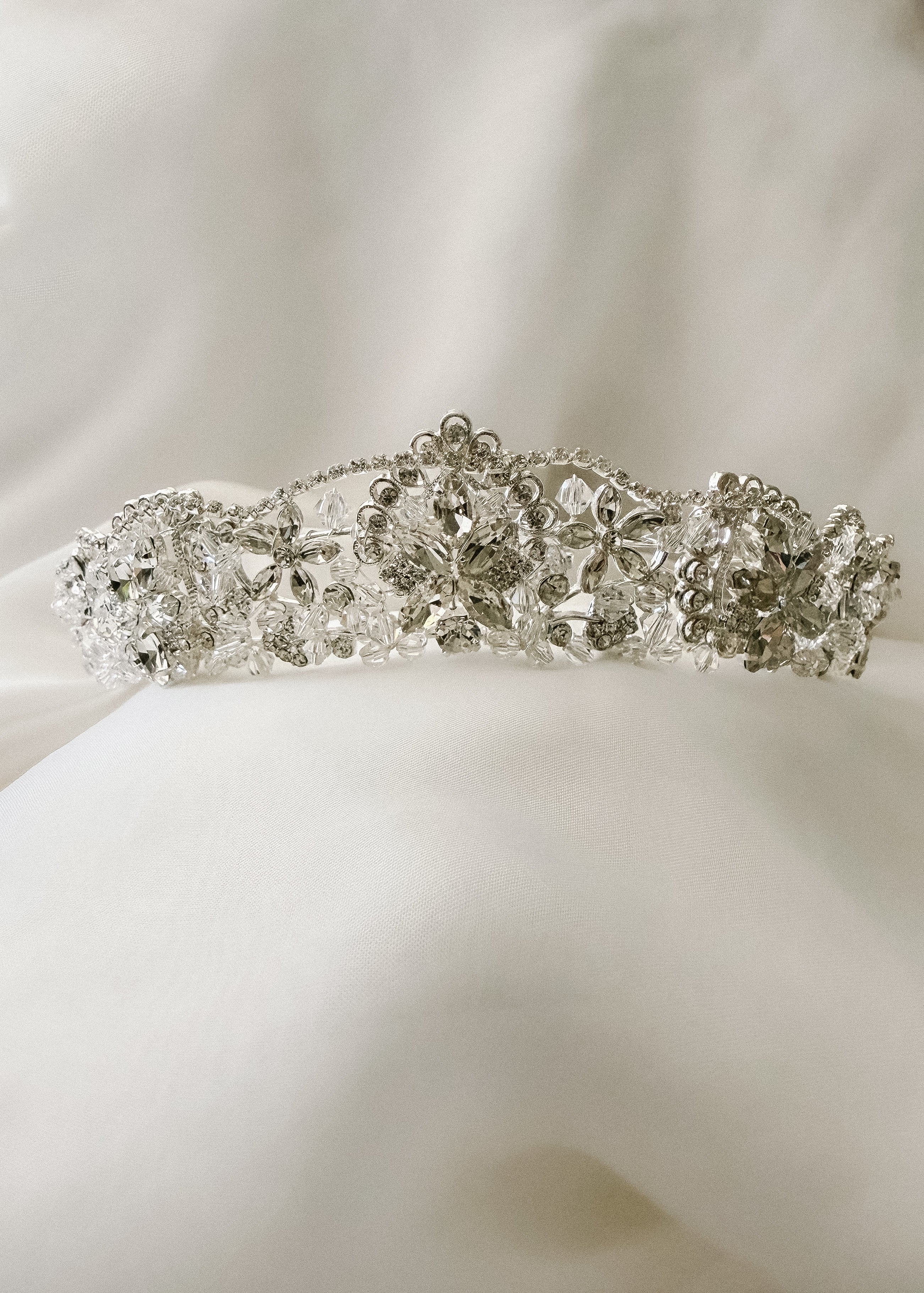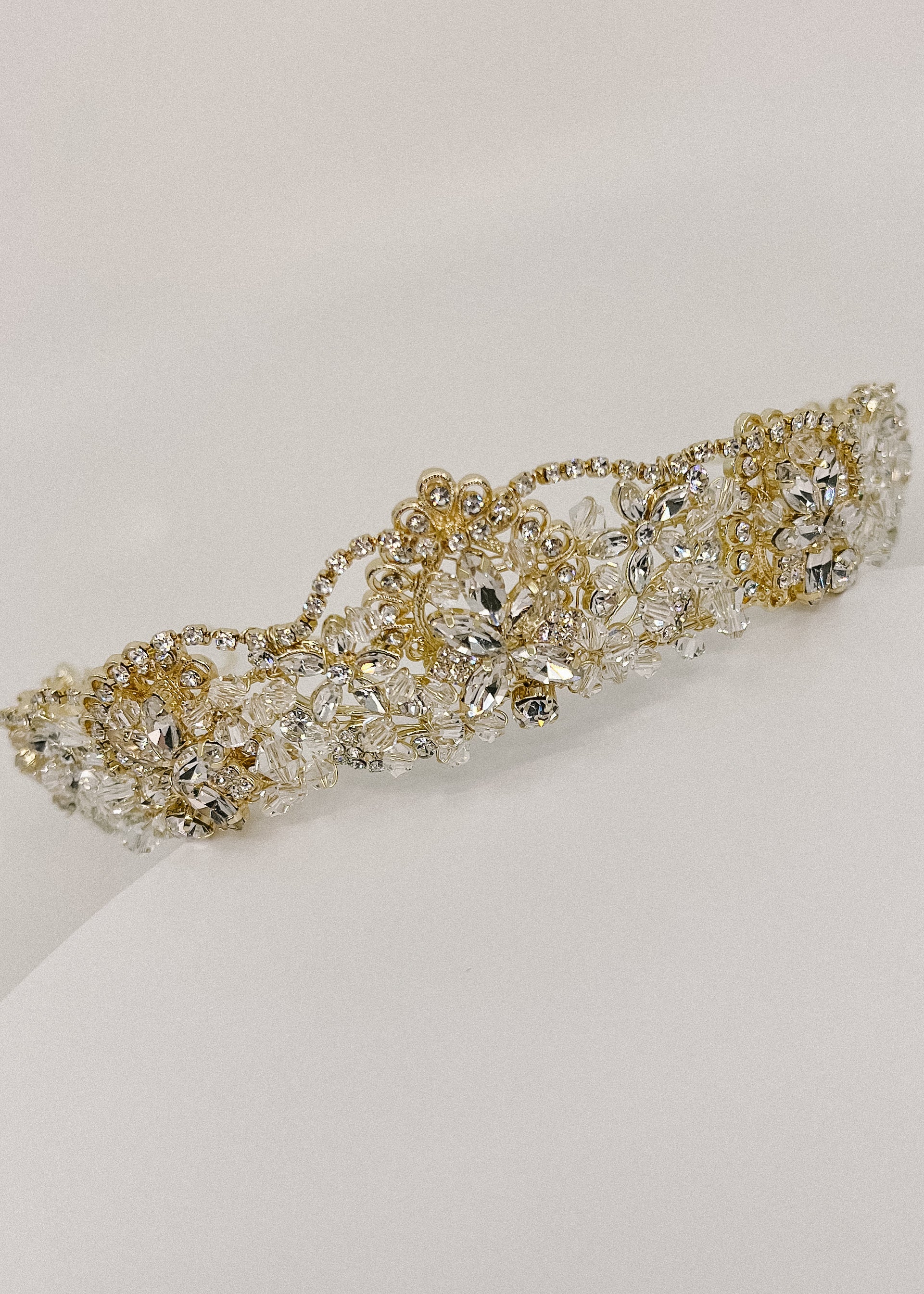 Aurora is an exquisite gold tiara that captures light with its sparkling crystals. Each stone is carefully positioned to create a radiant, elegant silhouette perfect for weddings, formal events, or special occasions. The lustrous gold finish complements any complexion and pairs beautifully with traditional or modern bridal aesthetics.
