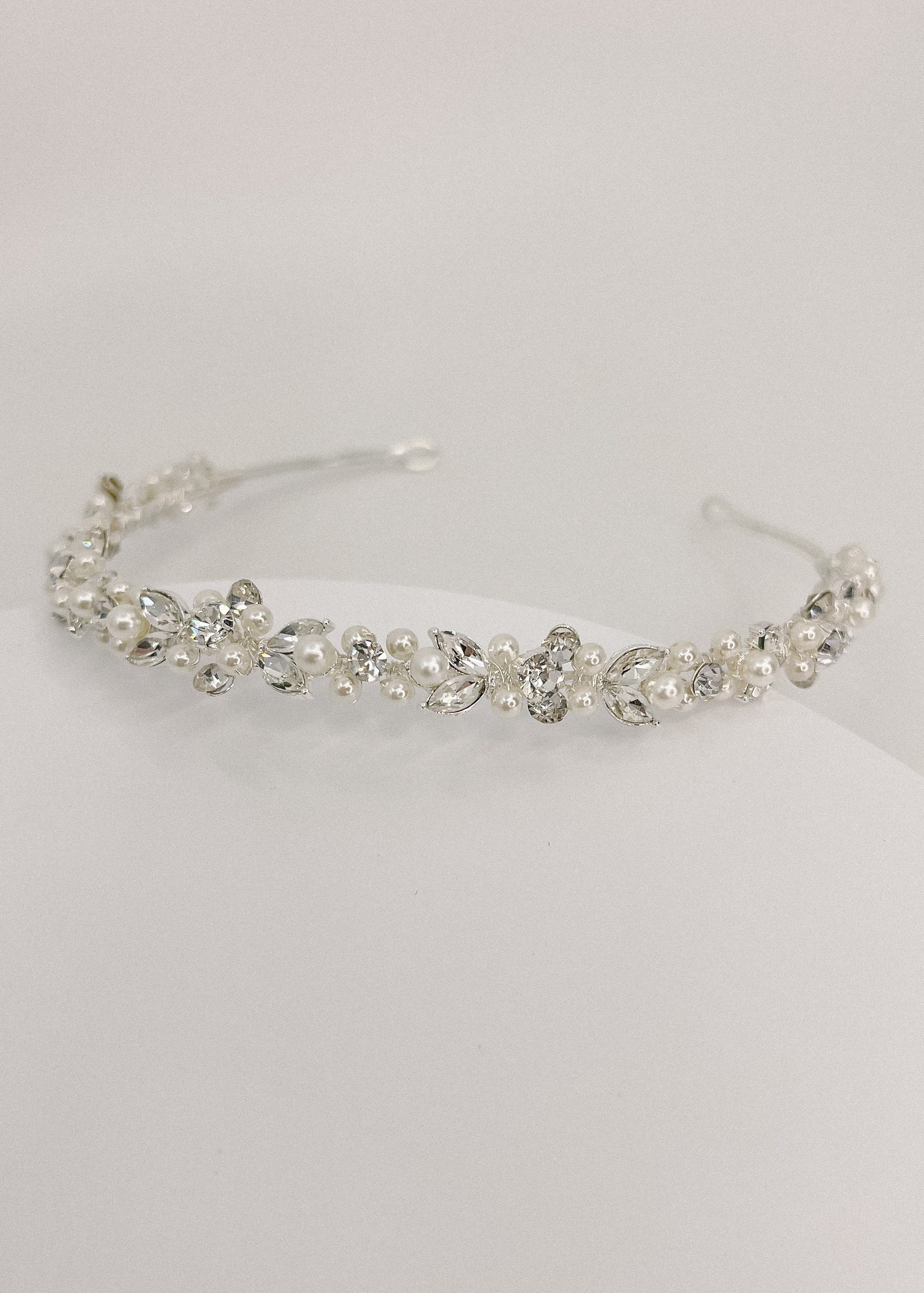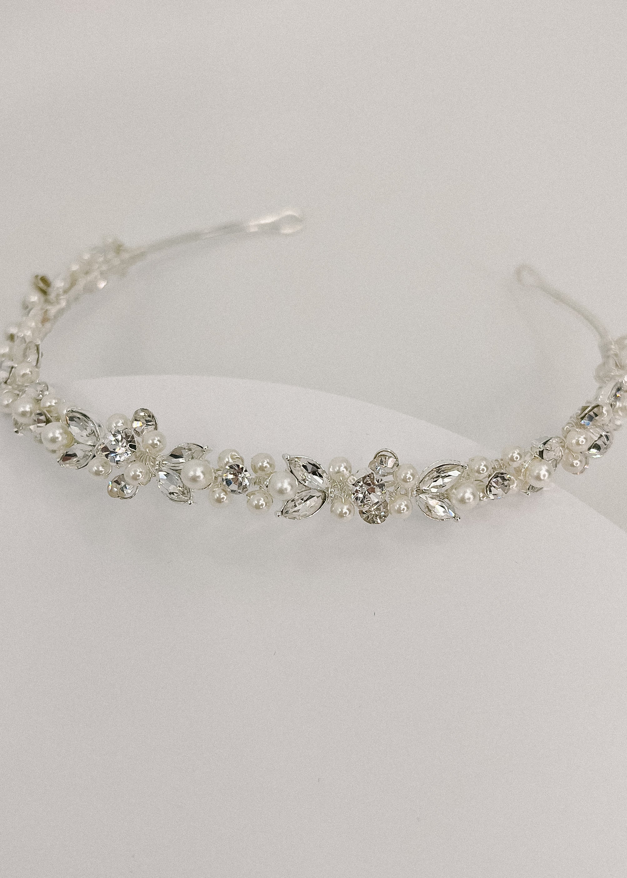Silver headband with crystals and pearls.