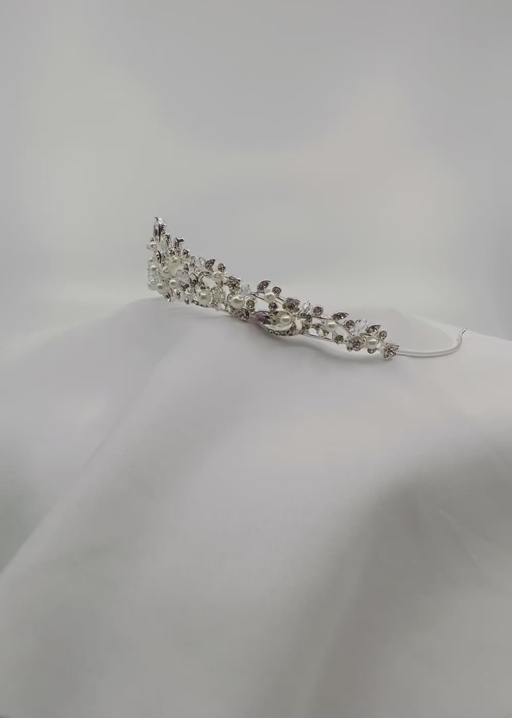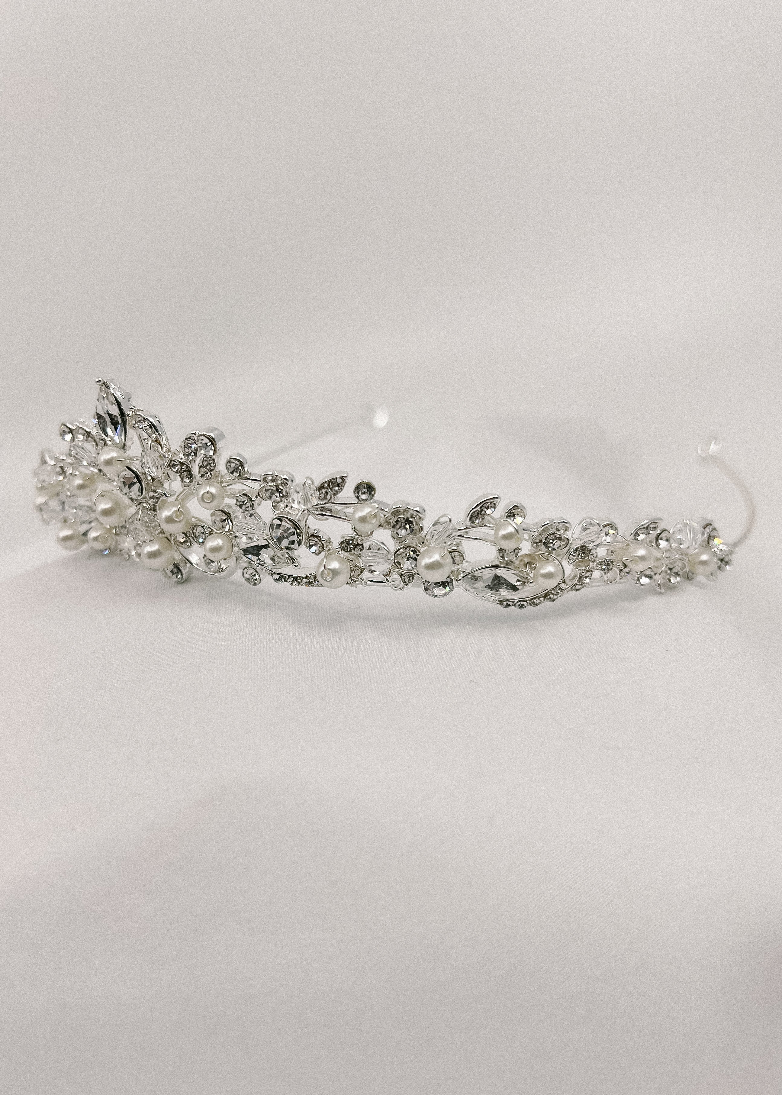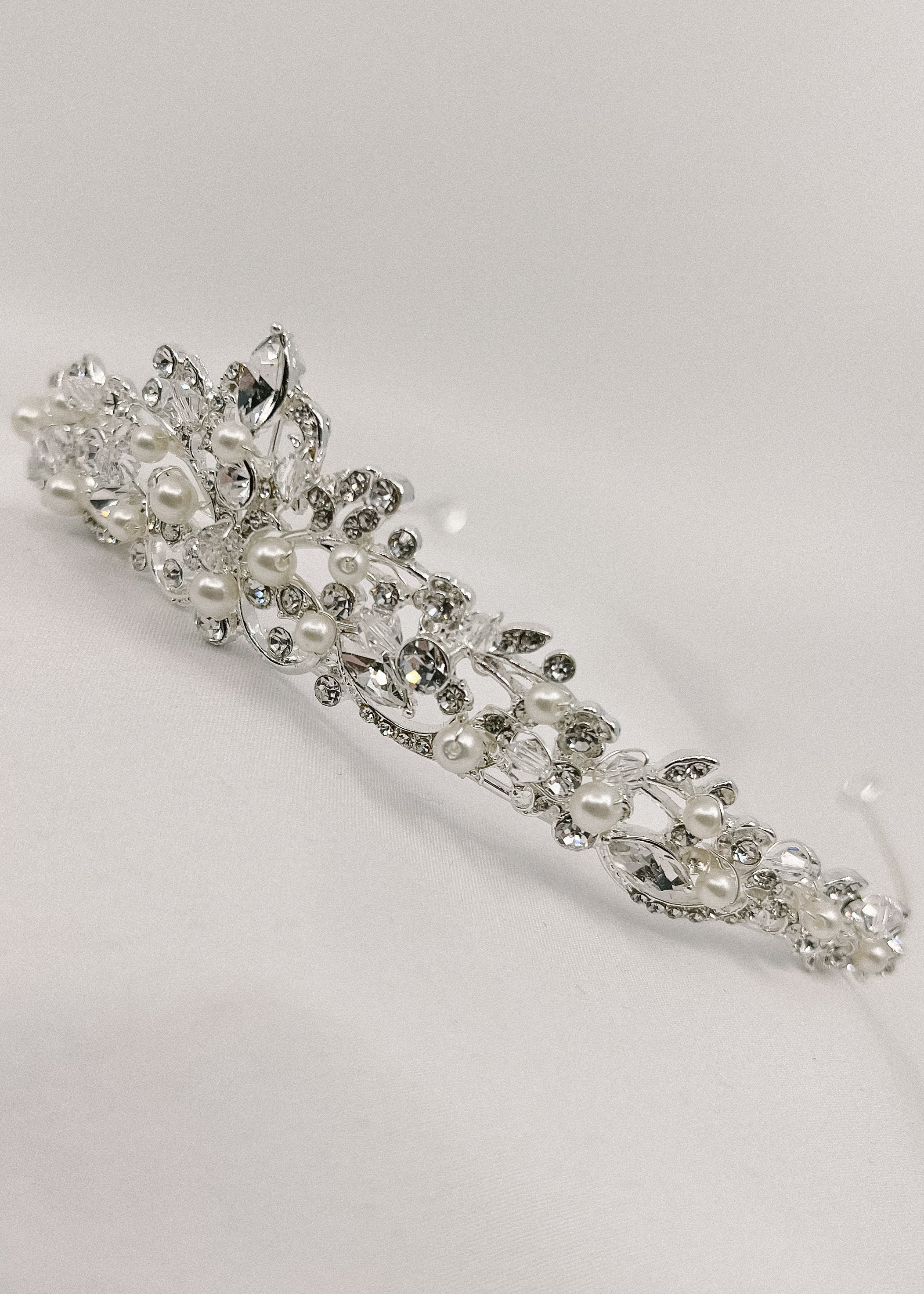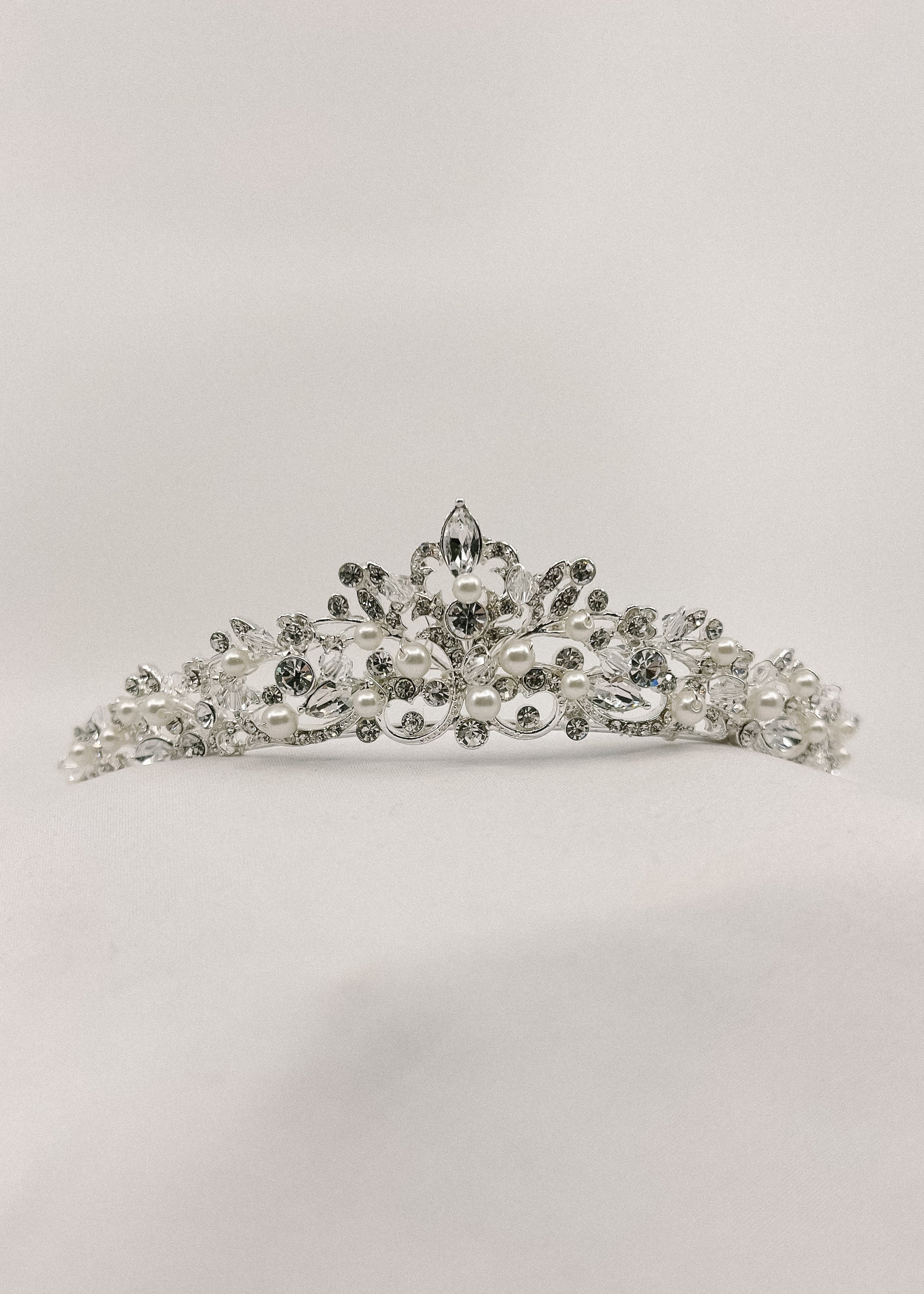 This stunning tiara boasts shimmering crystals and lustrous pearls, delicately crafted on a silver tiara. Elevate any bridal dress with a touch of glamour and sophistication. With Bertha, your brides will shine like a star and feel like royalty.