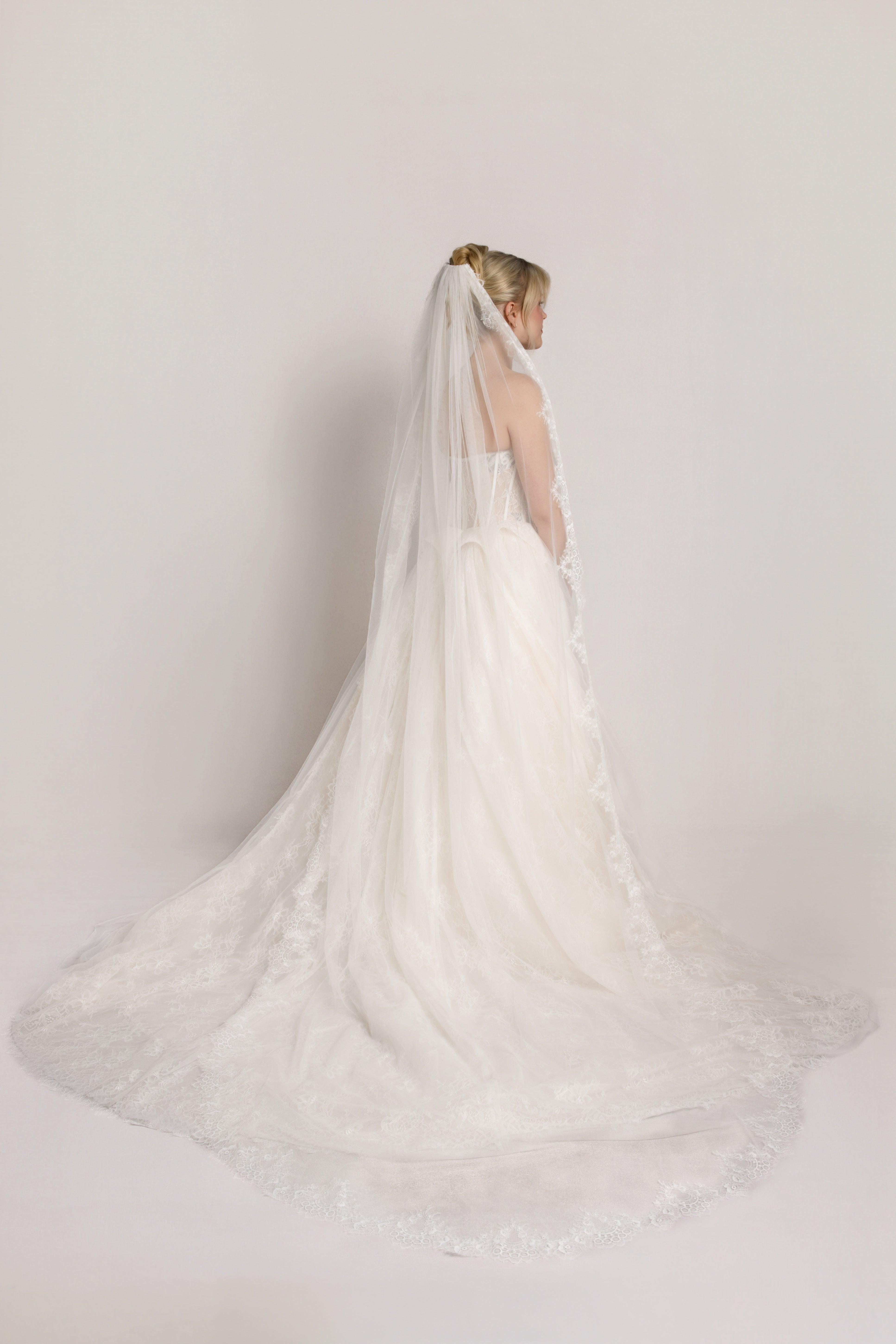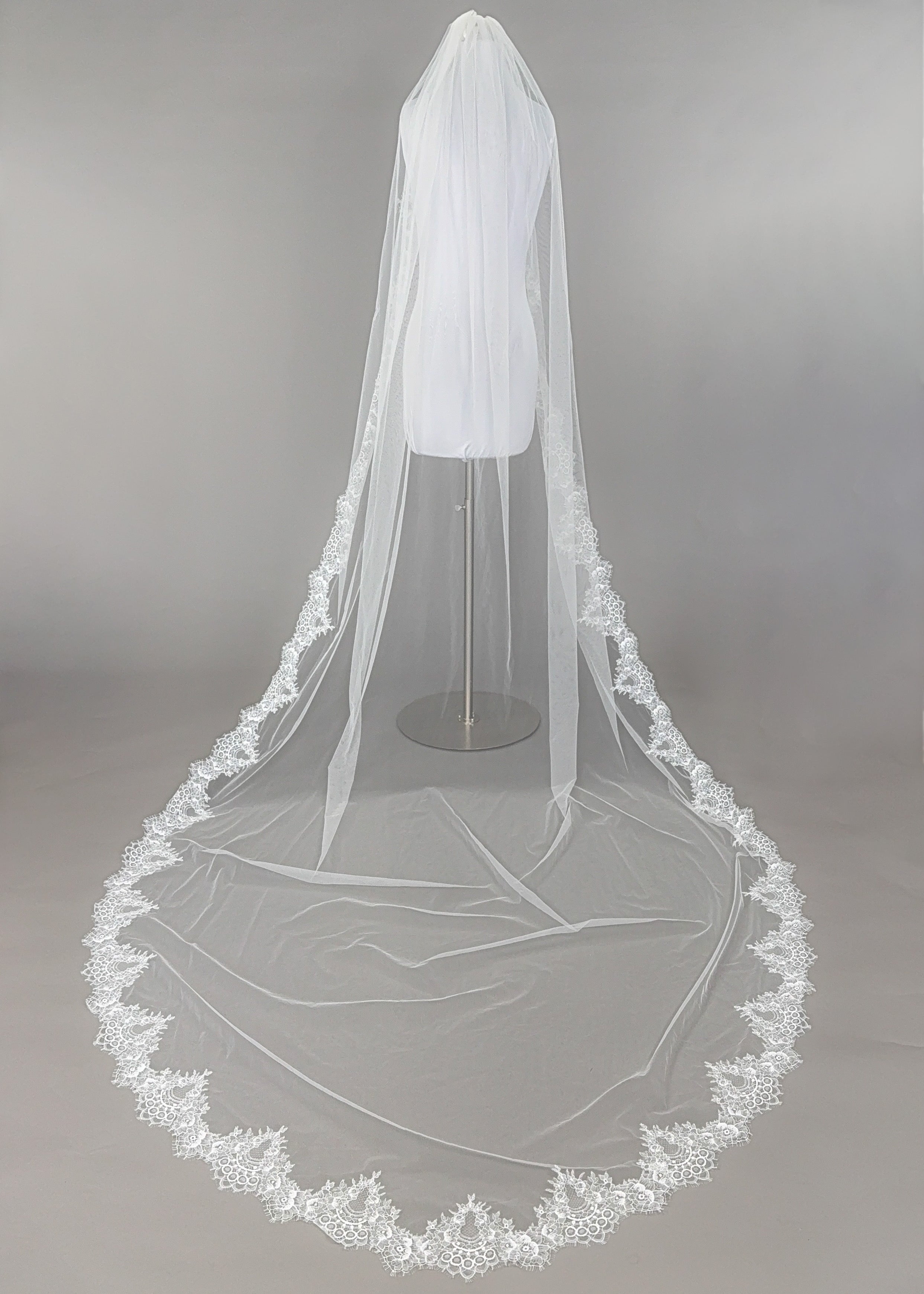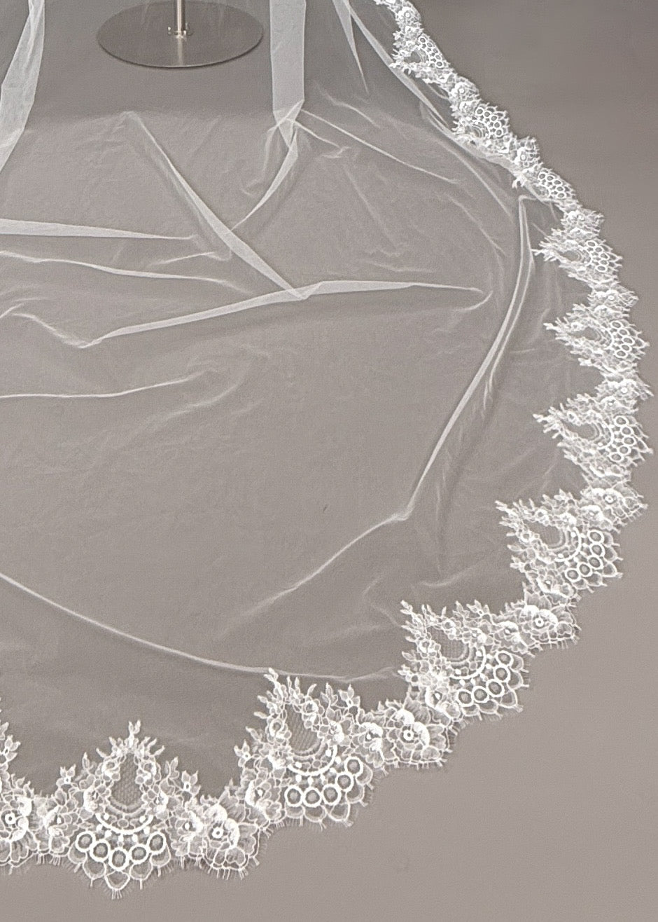 Claudia is a delicate cathedral veil adorned with luxurious Chantilly lace - a must-have accessory for brides on their special day.